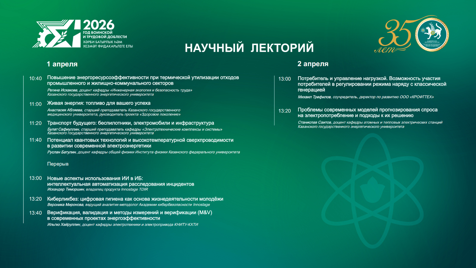 1 и 2 апреля в рамках на «Энергопроме» пройдут лекции экспертов из ведущих вузов и компаний Татарстана. Будут рассмотрены темы энергоресурсоэффективности, транспорта будущего, цифровой гигиены и другие вопросы.
